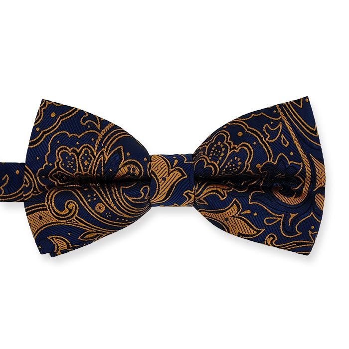 Marineblaue Fliege mit Blumenmuster in ockergelb. Durch den leichten Seidenglanz gibt diese Fliege eine sehr stilvolle Note zu Ihrem Outfit.