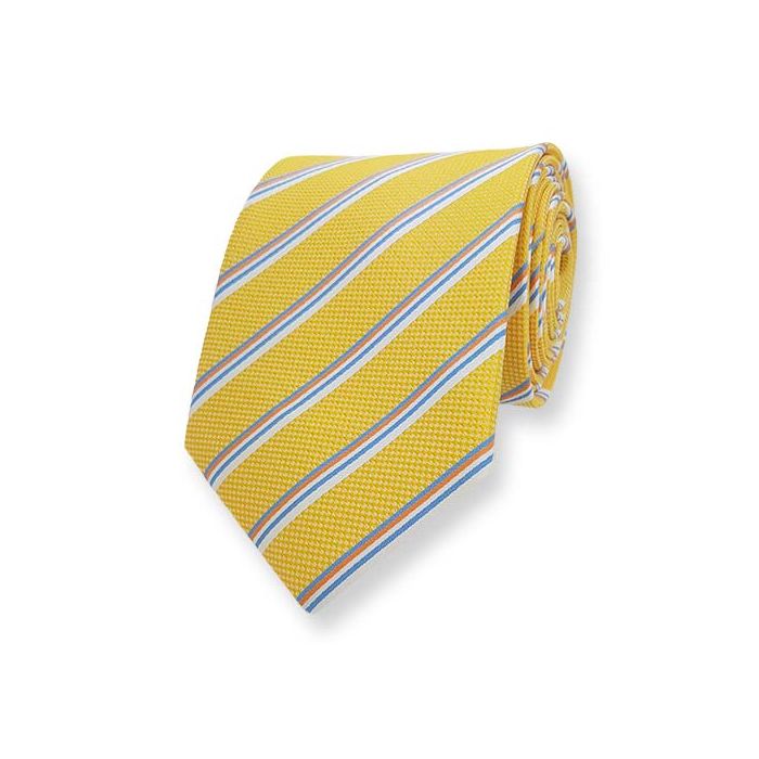 Modische Krawatte in gelb. Darauf liegt ein feines Streifenmuster in orange, weiß und Blau. Die Krawatte hat eine Gesamtlänge von 148 cm und eine Breite an der breitesten Stelle von 8,5 cm.